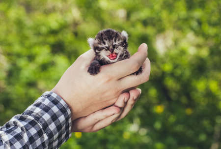 A man holding a small, beautiful striped color kitten, who opened his mouth and shows the tongue of nature.