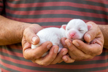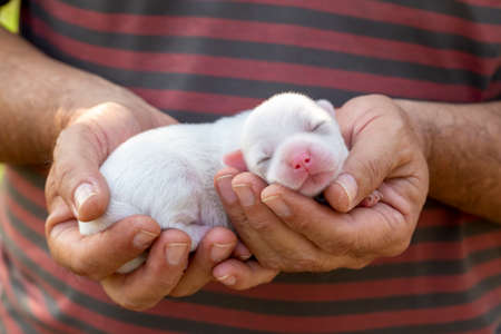Newborn white puppy in the hands of a man. The concept of a new life.
