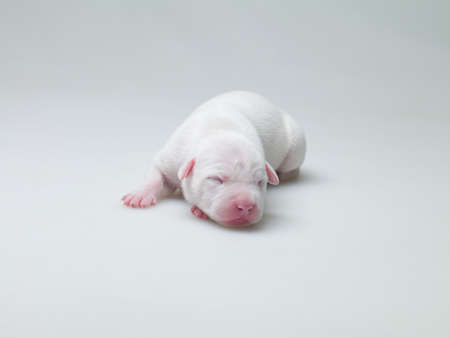 newborn puppy dog sleeping black labrador retriever day one of life on blanket