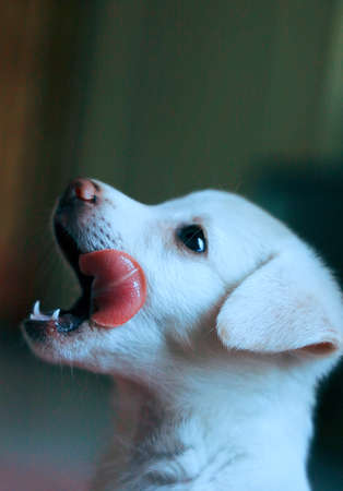 A cute sleepy brown puppy licking his mouth and leaning head on female hands of his new owner. Adopted puppy feels good and comfortable, trusting his new friend. Adorable baby pup biting girls finger