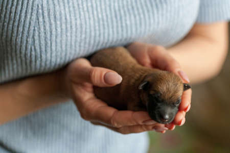Small puppy looking up while woman holding cute dog.The little puppy is cute sitting in the arms of the girl. Newborn puppy. Little beloved pet with its owner.