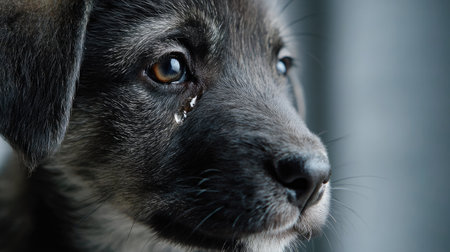 A close-up portrait of an adorable puppy with a tear in its eye, capturing the essence of innocence and emotion against a soft background.