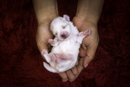 Close-up of a Newborn Maltese puppy. Maltese dog Terrier. Beautiful Maltese baby 7 day old. Puppy on hand. Dog on hands forming a heart shape. Hand on red carpet background.
