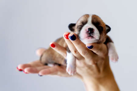 Cutest little ginger and white Welsh Corgi Pembroke puppy sleaping in human hands. Routine of dog breeder. Blue background, copy space.