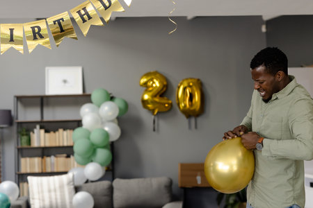 Mid-adult African American man holding gold balloon at home with foil 20 party balloons, copy space. Birthday, celebration, milestone, living room, interior, modern, minimalist