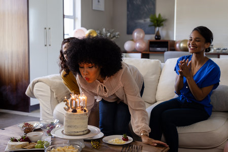 Blowing out candles, woman celebrating birthday with friends in cozy living room. Celebration, party, happiness, joyful, festivity, indoors