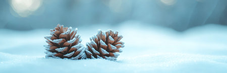A light blue winter background with snow and pine cones, with copy space on the right side. The background is blurred, creating an overall softness. There are small lights in some areas, adding depth and texture. It feels serene and peaceful, perfect for holiday designs or festive themes. This photo would make a great website banner or social media post. The overall color scheme of cool blues creates a sense of calm and tranquility. --ar 31:10 --v 6.1 Job ID: 5698e2f6-8a98-4a3e-9193-3ffbd2d6a52b