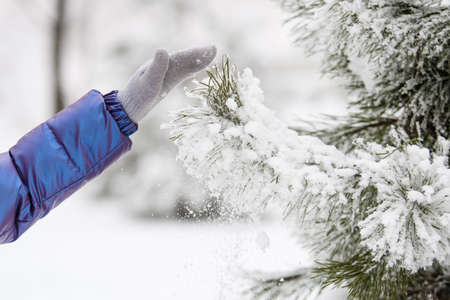 A child's hand shakes off snow from a pine branch. Close-up, Selective focus.
