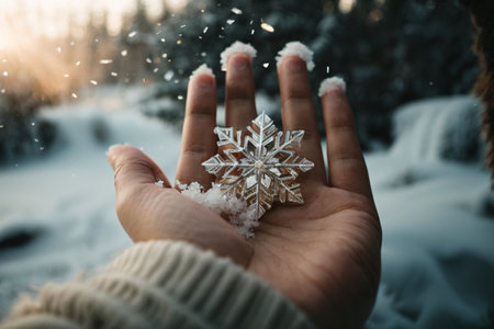 Snowflakes landing on a person's outstretched hand, with the intricate details of each flake visible.