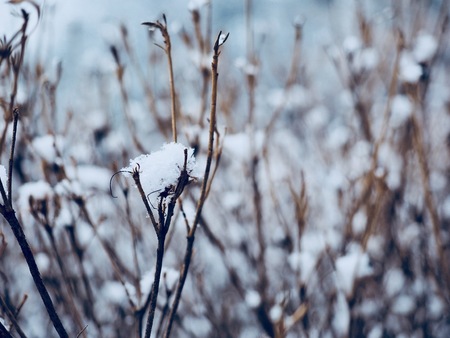 Hoarfrost on plants. Winter abstract macro of rime on plants.