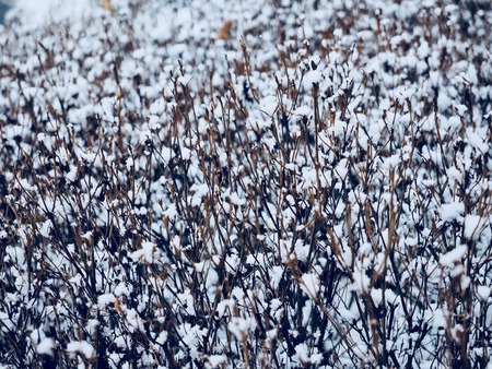 Winter texture of the branches of trees covered with a thick layer of snow.