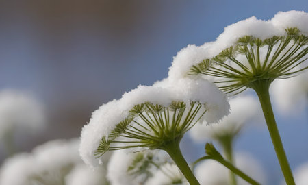 A serene winter scene featuring frost-covered flowers. The image evokes feelings of peace and tranquility.