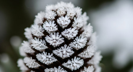 A detailed view of a pine cone covered in frost, set against a blurred winter background. The frost-covered scales of the pine cone are intricately visible, showcasing the delicate beauty of winter.