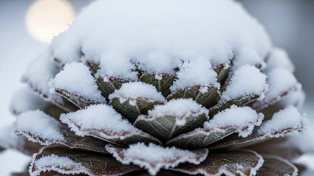 A delicate flower, dusted with frost, emerges resiliently against a soft, muted background. The intricate, icy details showcase nature's beauty as the petals glimmer under the gentle light, evoking a sense of serene solitude in winter.