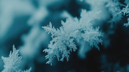 A stunning close-up of delicate snowflakes resting on a frosty surface. The cool tones and intricate details beautifully capture the essence of winter.