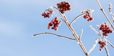 A branch covered in frost and snow. The branch is surrounded by a blue sky. Concept of calmness and serenity