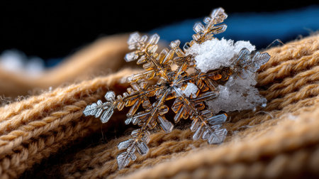 A close-up of snowflakes falling on a woolen glove, each flake intricate and unique against the soft fabric.