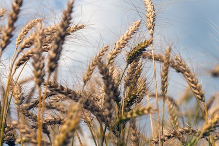 Golden wheat spikelets on field ripe crop before harvesting on summer day on blue sky background