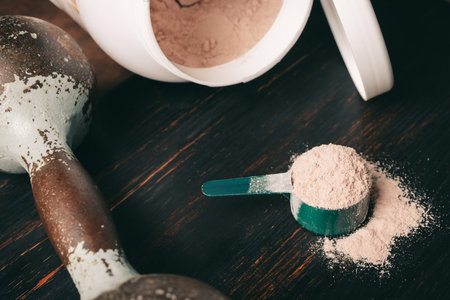 Whey protein powder with measuring Scoop, sports bodybuilding supplement.