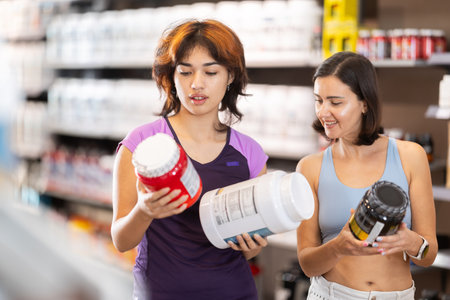 Close up of women with measuring scoop of whey protein, jar and shaker bottle, preparing protein shake.