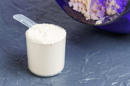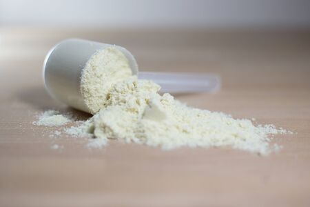 Whey protein powder on scoop. Fitness and gym diet nutrition