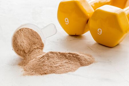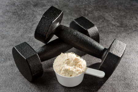 scoop with protein and a pair of dumbbells on a rough background. The concept of sports nutrition.