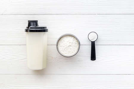 Whey protein isolate with a measuring spoon on a white background. Sports nutrition of athletes