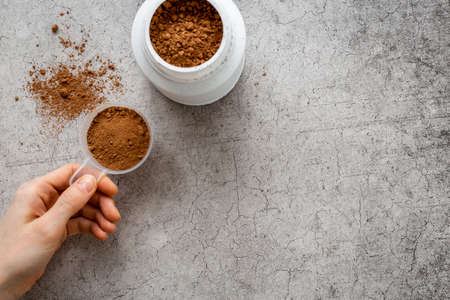 Scoop or spoon of whey protein with visible texture. Chocolate flavor. Concrete background