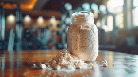 A protein shaker cup filled with chocolate powder sits next to a mound of powder on a gym table, representing fitness, nutrition, and healthy lifestyle choices.