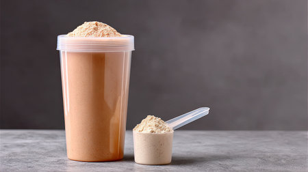 A large container filled with protein powder sits beside a small scoop. Ideal for fitness and nutrition themes, this image showcases healthy lifestyle choices.
