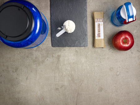 Closeup on big blue protein jar, shaker, measuring spoon with powder, raw protein bar, red apple laying on the floor.