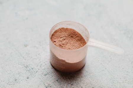 Double chocolate whey protein powder scoop nutrition healthy food bodybuilding.