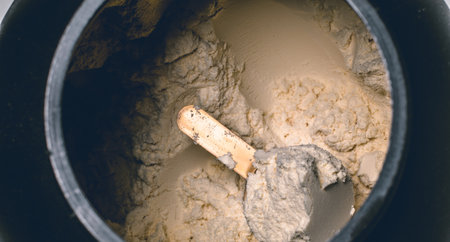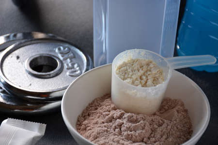 Protein powder in a scoop, ready for a post-workout shake, fitness and nutrition focus