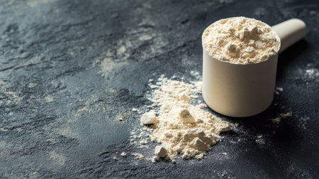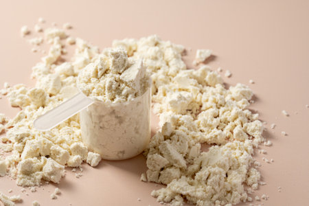 Close-up of a white measuring scoop filled with protein powder placed on a beige surface. Powder is scattered around the scoop, creating a minimalistic composition.