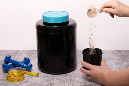 Man scooping protein powder into a shaker bottle. Nutritional supplement preparation for fitness and healthy lifestyle.