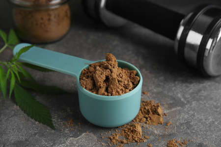Hemp protein powder, fresh leaves and dumbbell on gray table, closeup