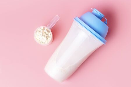 Cocktail shaker and measuring spoon with protein on pink background, top view.