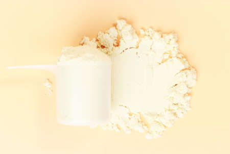 Portion of whey protein powder top view. A full scoop of whey protein. Top quality sports nutrition in powder form.