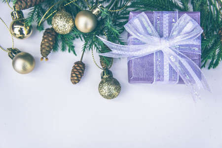 New year and Christmas background top view with decoration and fir tree and big copy space