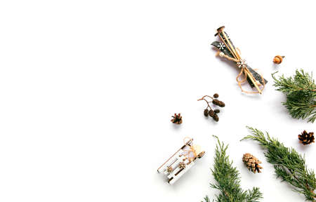 Creative winter composition on white background. Copy space. Top view. Flat lay