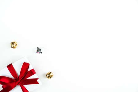 Beautiful holiday or Christmas background image of a small red ribbon wrapped white box present or gift in the lower left corner on a white backdrop with silver and gold jingle bells and copy space.