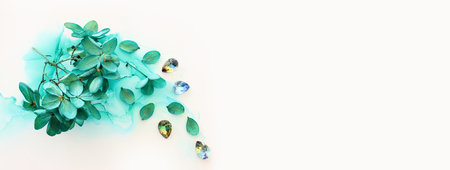 Creative image of emerald and green Hydrangea flowers on artistic ink background. Top view with copy space