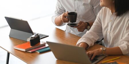 Close-up view of young female designer team working on their project together with tablet and laptop computer in workspace