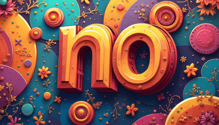 This eye-catching image features a bold, 3D no in vibrant orange and red, set against a playful backdrop of swirling colors and whimsical flowers. The intricate design combines elements of fun and creativity, making it perfect for expressing refusal or rejection in a lively and artistic way.