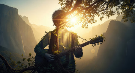 An artistic depiction presents a figure integrated with natural elements, playing a guitar. The image showcases warm sunlight, creating a dreamy atmosphere. The composition includes a mountain range, suggesting an outdoor environment, possibly useful for various editorial or commercial projects.