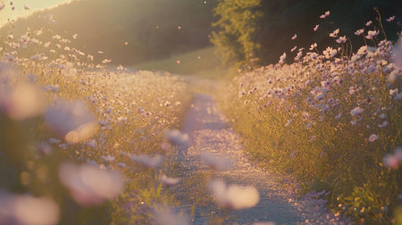 A picturesque scene of a winding path surrounded by blooming wildflowers, illuminated by soft golden sunlight during sunset, evokes tranquility and beauty.