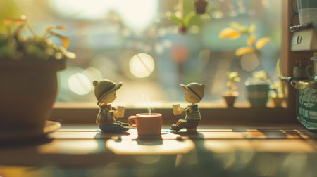 Two adorable tiny characters engage in a conversation about important matters in a miniature coffee shop