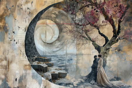 abstract background with a couple under a tree next to sea illustration