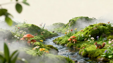 Fantasy landscape with mushrooms and plants in a stream. 3d rendering
