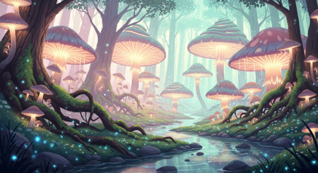 Enchanted Forest with Fields of Luminescent Flowers and Sparkling Streams in a Mystical Fairytale like Landscape Serene Tranquil and Captivating Dreamy Nature Scene